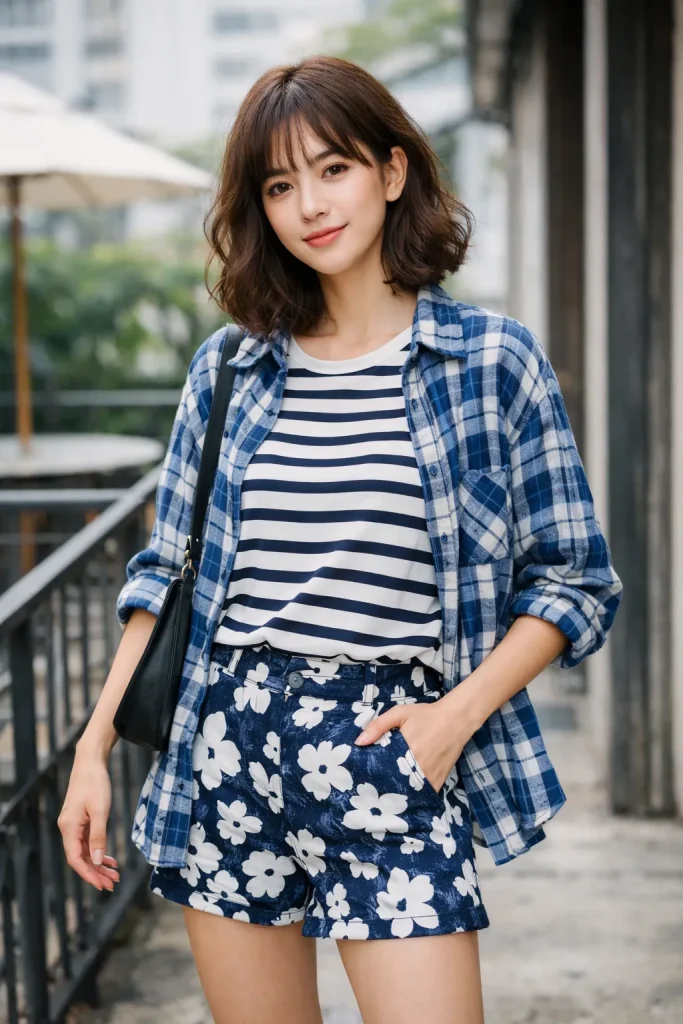 ใส่กับเสื้อลายทางดูสิ! ใครว่าลายชนลายจะใส่แล้วไปไม่รอด จริง ๆ แล้วก็มีวิธีมิกซ์ง่าย ๆ อยู่นะ คือให้เลือกเสื้อสองชิ้นที่สีตัดกัน อย่างในรูปคือ ขาว – น้ำเงิน และเสื้อลายนั้นให้เลือกที่ลายไม่ถี่นัก แค่นี้ก็สามารถใส่เสื้อลายชนลายเพิ่มความเก๋ให้กับสไตล์แต่งตัว แต่ถ้ากังวลว่าลายชนลายจะลายตามากไป แนะนำเป็นใส่เสื้อลายสก็อตคลุมเสื้อสีพื้นง่าย ๆ ก็ได้น้า ส่วนเสื้อคลุมจะเป็นตัวสั้นหรือตัวยาว หรือจะใส่เป็นเสื้อเชิ้ตตัวเดียวเดี่ยว ๆ กับขาสั้น ก็แล้วแต่สาว ๆ เลยจ้า แถมดูท้าทายไอเดียของเราอีกด้วย