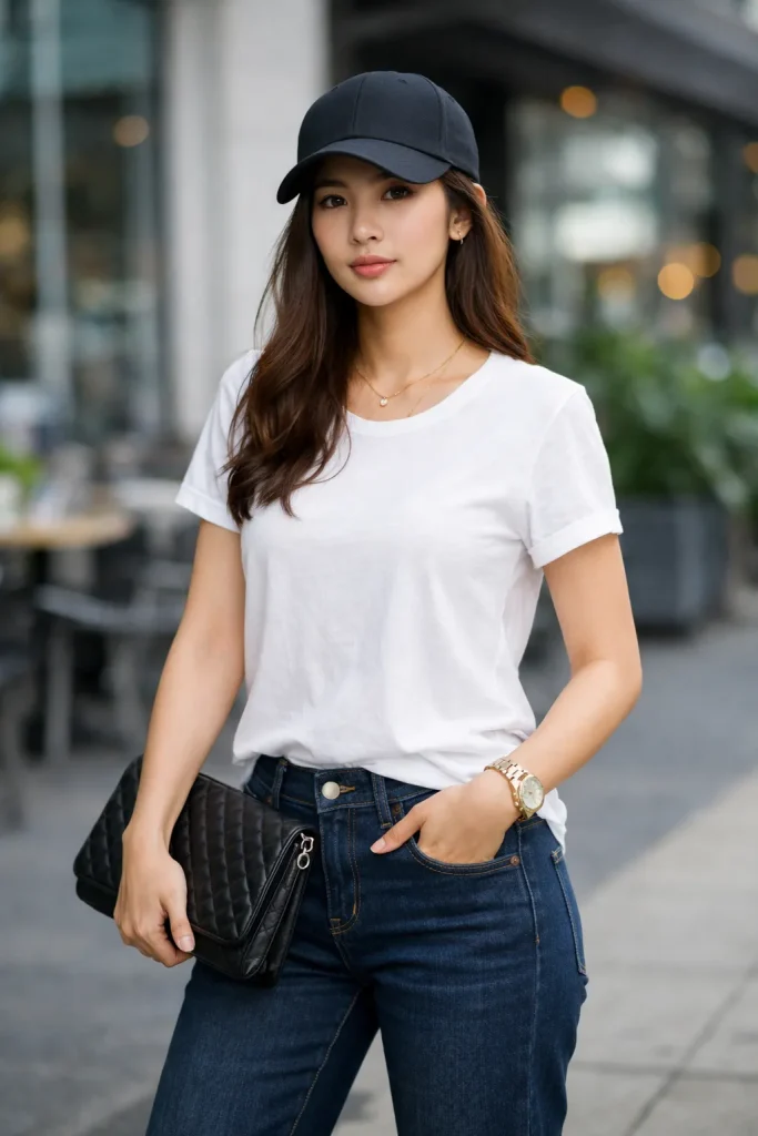เซอร์ให้สุดกับกางเกงยีนส์ดิบ ๆ แต่บางคนแต่งออกมาแล้วดูเซอร์จนหมดสวย จะลองเป็นกางเกงยีนส์เรียบ ๆ สไตล์แคสชวลก็ยังเวิร์คนะคะ อันนี้เรามีทริคนิด ๆ หน่อย ๆ คือการหาเครื่องประดับ พร็อบ อย่างเช่น ถือคลัทช์เก๋ ๆ หรือใส่หมวกแก๊ปชิค ๆ สักใบมาใส่ ให้เห็นถึงความตั้งใจในการแต่งตัวขึ้นอีกหน่อย จะได้ไม่ดูเซอร์จนไม่มีสไตล์