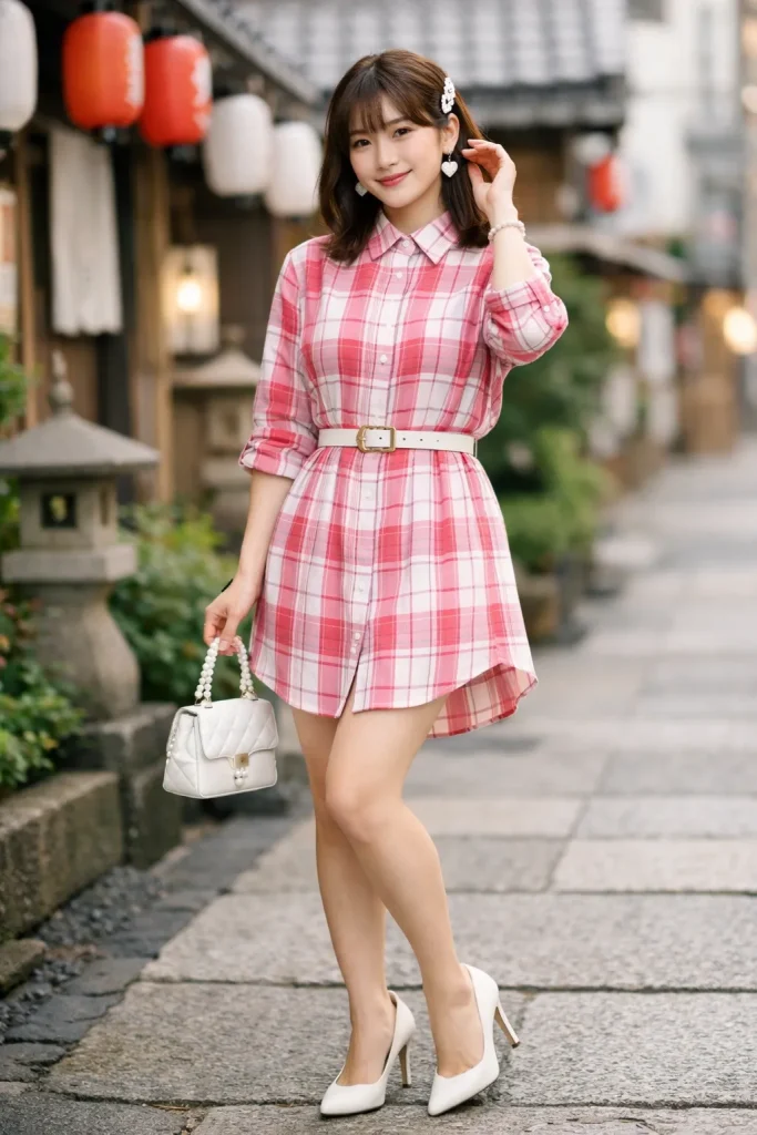 ใครว่าเสื้อลายสก็อตหวานไม่ได้จ๊ะ ลองหาเชิ้ตยาวมาใส่กับส้นสูง อาจเพิ่มเข็มขัดเข้าไปหากไม่อยากดูตันหรือหากอยากได้ลุคเจแปน ๆ ก็ติดกระดุมให้ขึ้นมาถึงเม็ดบนสุด แล้วแมชต์กับเครื่องประดับน่ารัก ๆ เกิดชัวร์