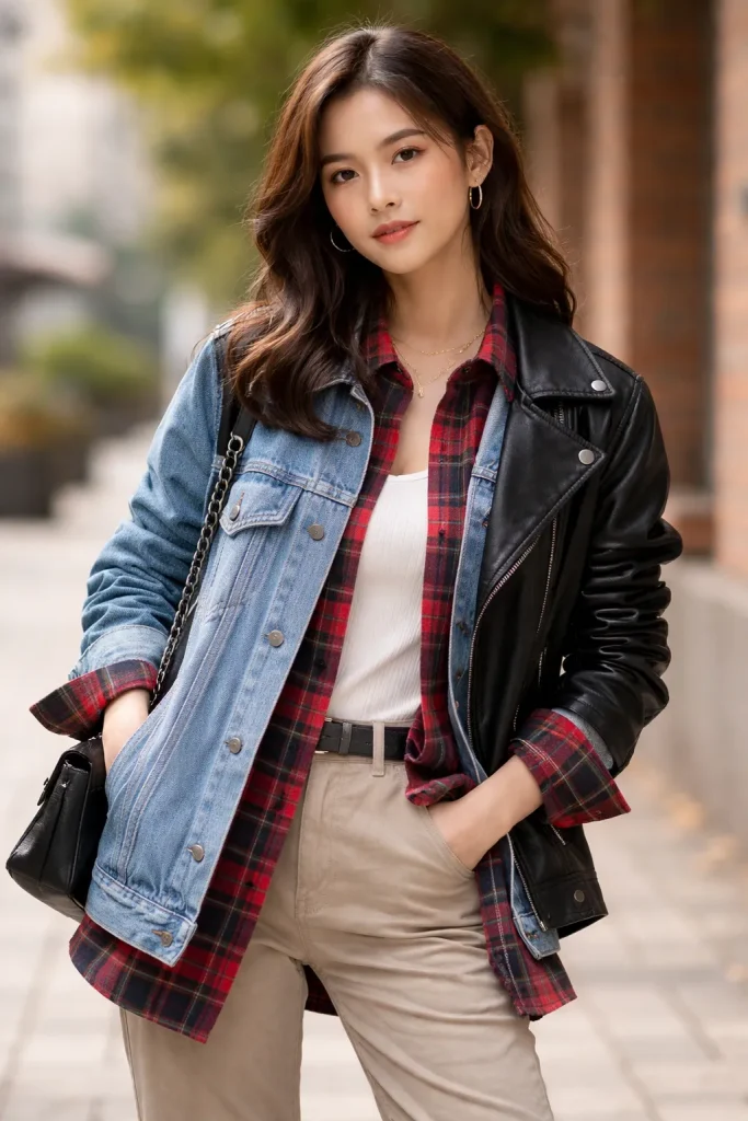เล่นเลเยอร์กับเสื้อคลุมหลาย ๆ ชั้น หากกลัวจะร้อนให้ใส่ตัวในบาง ๆ ไว้ก่อน แล้วหาเสื้อคลุมเป็นแจ็คเก็ตยีนส์หรือเสื้อหนังก็ได้ ลายของเสื้อลายสก็อตจะทำให้ชุดดูไม่น่าเบื่อ เพิ่มความน่าสนใจให้ลุคของเธอได้