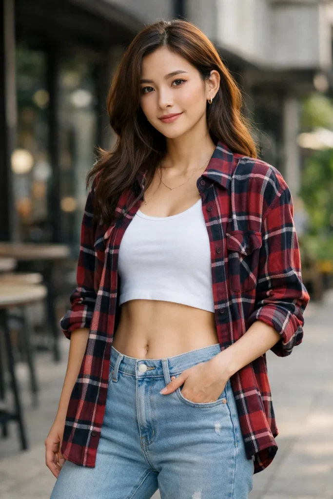 บางทีก็อยากใส่เสื้อครอปโชว์เอวสวยแต่ก็ยังหวิว ๆ หรือบางคนก็อาจจะติดกลัวว่าใส่เสื้อครอปตัวเดียว จะเอ็กซ์เซ็กซี่ไปหรือเปล่า งั้นเบรคความเอ็กซ์ด้วยเสื้อลายสก็อตแมน ๆ ไปเลย เลือกที่หลวมสักหน่อยให้คลุมสะโพกแต่ไม่หลวมโคร่งจะช่วยพรางหุ่นได้อีกด้วยนะ