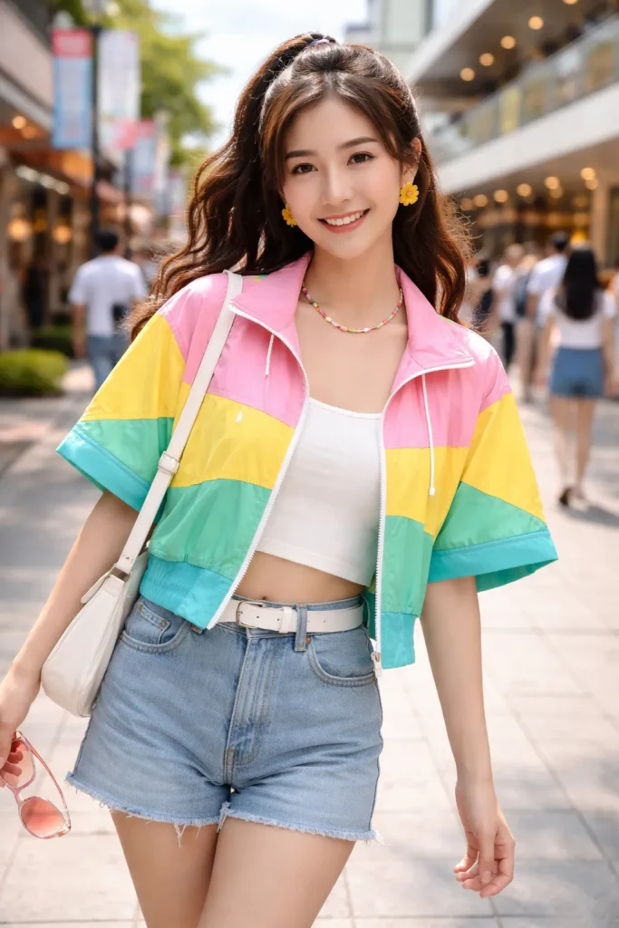 สำหรับอากาศร้อน ๆ อย่างประเทศไทยแลนด์แบบนี้ แจ็คเก็ตแขนสั้นสีสันสดใสก็น่าจะเป็นไอเท็มที่สามารถนำมาใส่เดินสยามได้นะจ๊ะ แต่ข้างในอาจจะใส่อะไรที่ระบายอากาศซักหน่อย จะได้ไม่เป็นลมกันกลางสยาม หรือกลางเจเจนะเธอ