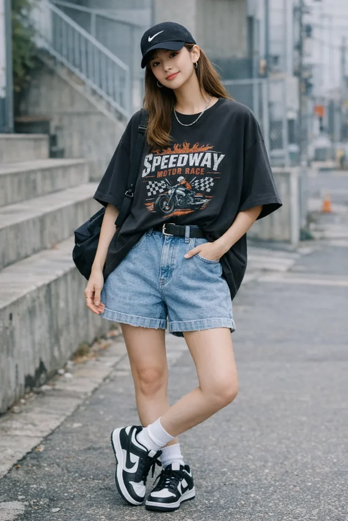 - ลองหยิบเสื้อยืดทรงโอเวอร์ไซส์ แมทช์เข้าคู่กับกางเกงขาสั้นทรงวินเทจดูสิ ลุคนี้จะทำให้คุณดูน่ารัก มีสไตล์ ได้ทั้งความวินเทจและดูเท่ในแบบสตรีทที่ผสมผสานไปด้วยกัน ได้อย่างลงตัวทีเดียว