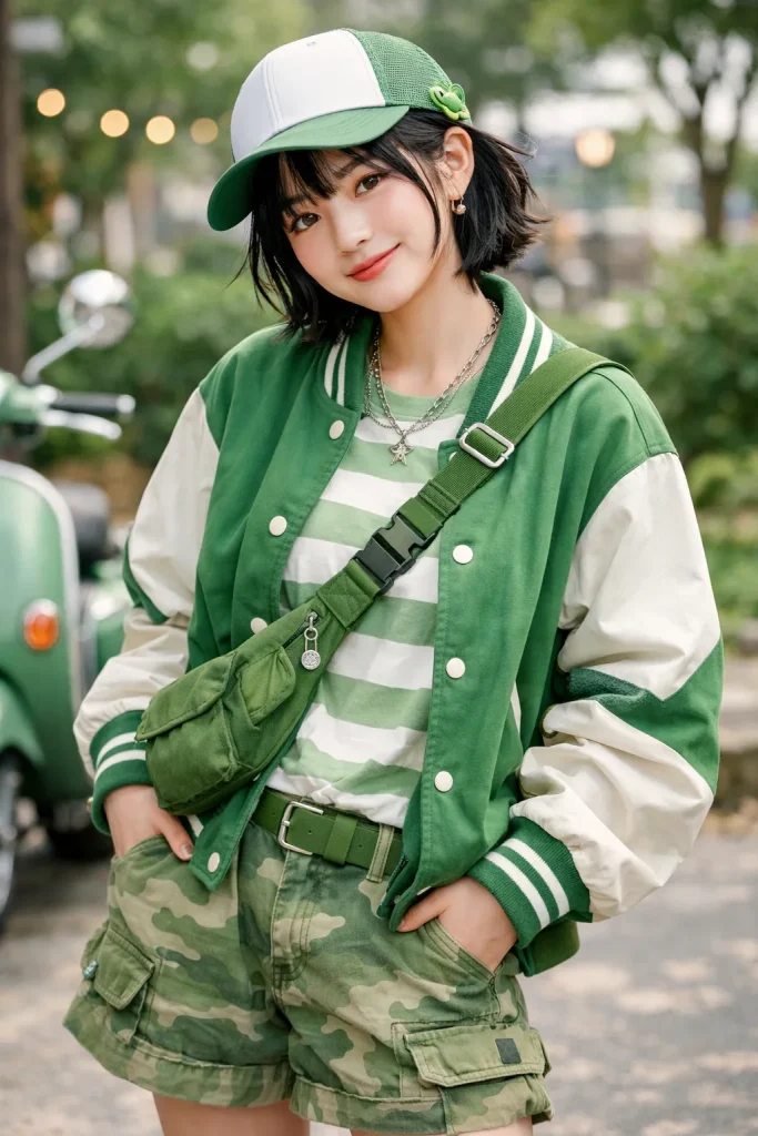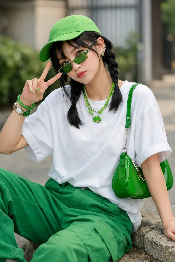 แร็ปเปอร์ @_miumiux_ แมทช์เสื้อยืดกับกางเกงสีเขียว พร้อมแอคเซสเซอร์รี่สีเขียว ได้ลุคน่ารัก ๆ มีความบอยแบบสายฮิป
