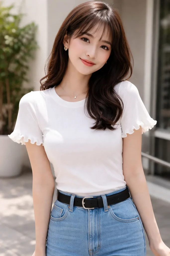 หรือสาว ๆ คนไหนเบื่อเสื้อยืดธรรมดา ๆ ลองหาเสื้อแขนสั้นที่ปลายแขนเป็นระบาย ๆ แบบนี้ก็ดูน่ารักไปอีกแบบนะ : D