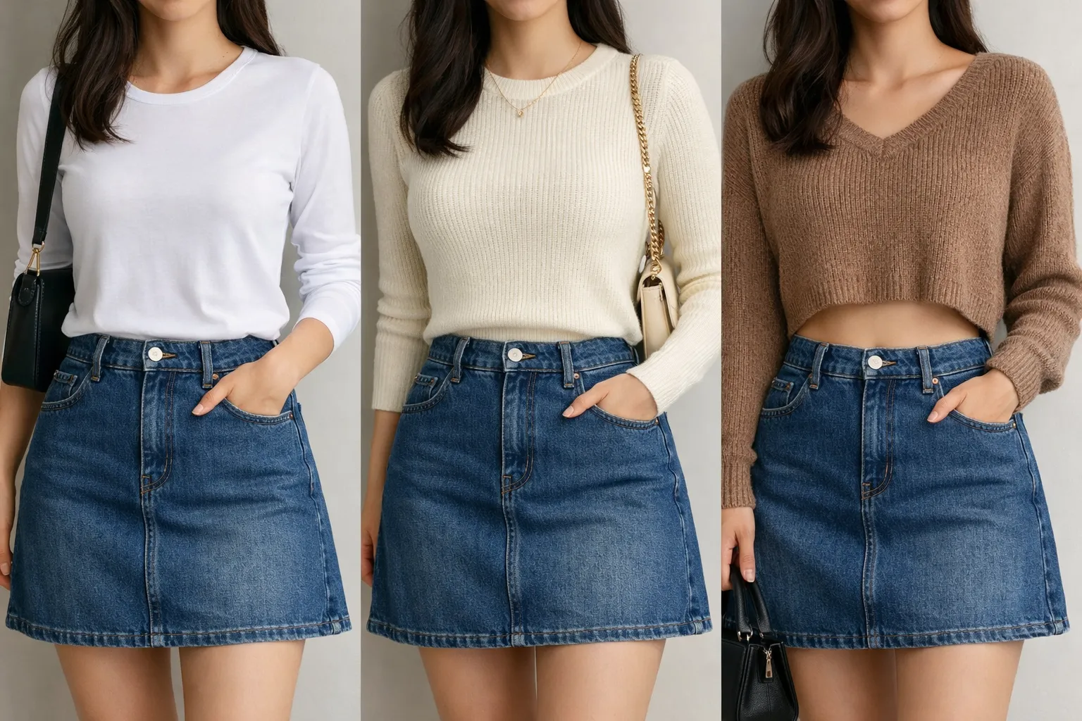 กระโปรงยีนส์ทรงเอ + เสื้อแขนยาว