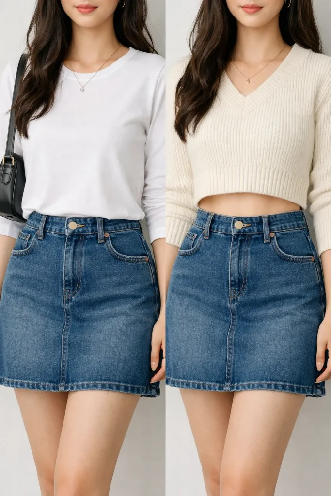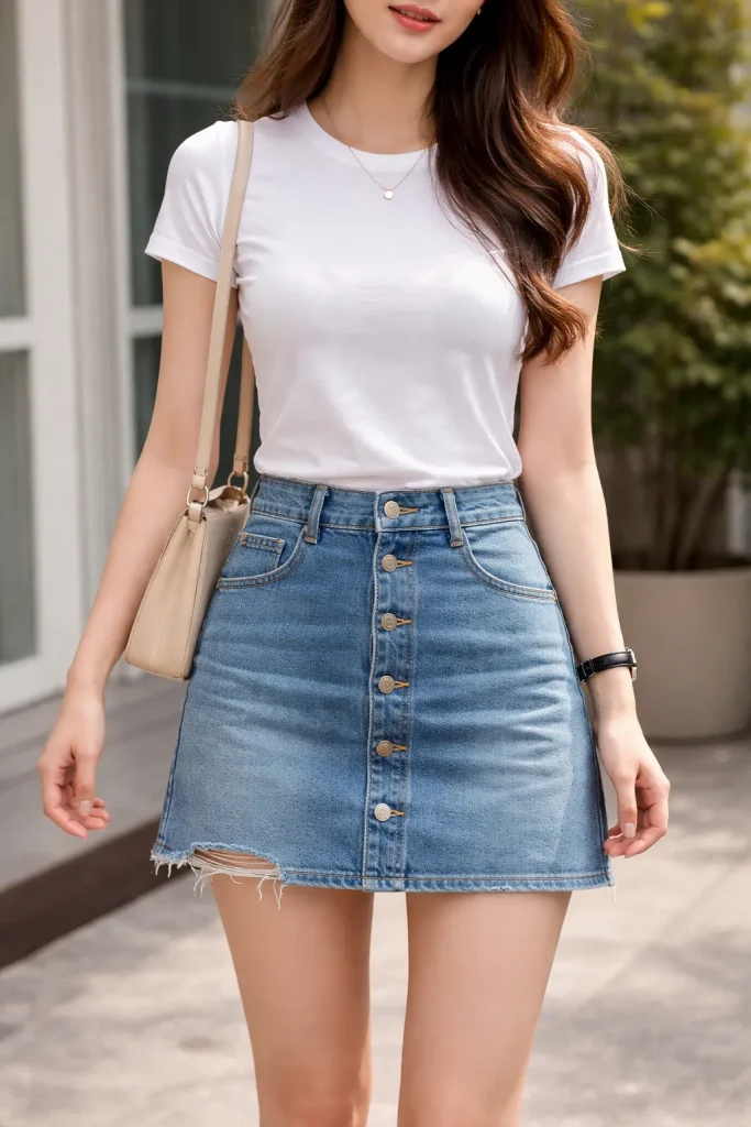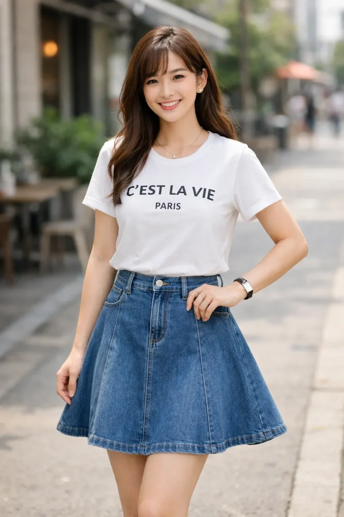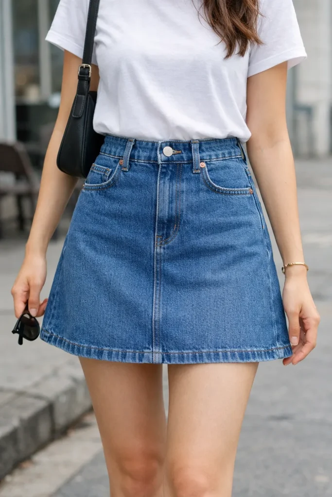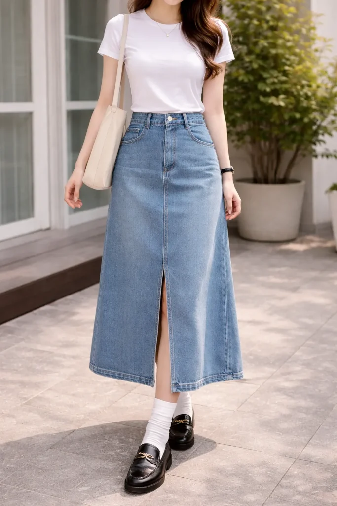 กระโปรงยีนส์ทรงเอ + เสื้อยืดสีพื้น