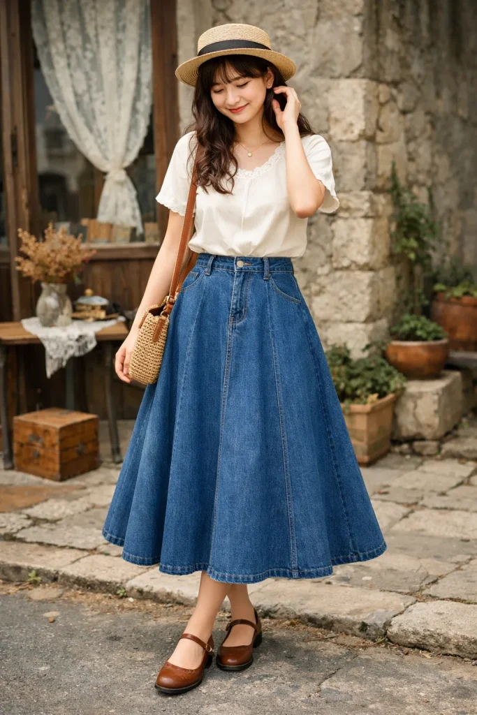 สาว ๆ คนไหนที่ไม่ชอบใส่กระโปรงสั้น ๆ ลองหา กระโปรงยีนส์ ทรงเอ แบบยาวประมาณเข่า หรือ ยาวกว่านั้น ไม่บานมาก เราว่าน่ารักกำลังดีเลยแหละ