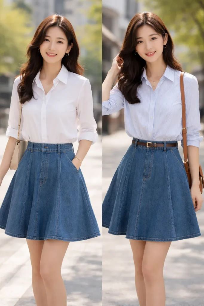 กระโปรงยีนส์ทรงเอ + เสื้อเชิ้ต