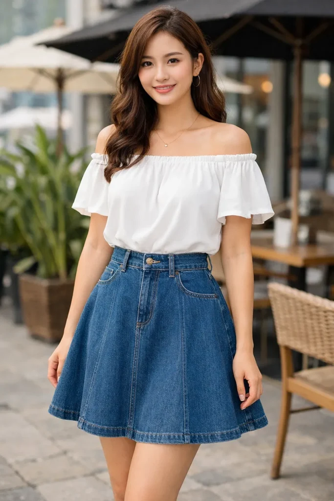 กระโปรงยีนส์บาน + เสื้อเปิดไหล่