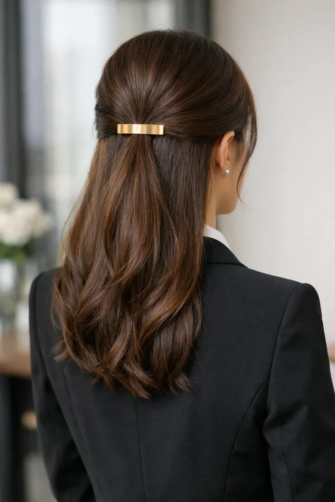 หากว่าใครต้องการทรงผมสุภาพ สำหรับการออกไปทำธุระที่ค่อนข้างต้องการลุคแบบเป็นทางการ ทรงผมรวบครึ่งหัว หรือมัดรวบเรียบร้อย แล้วเลือกติดกิ๊บที่ไม่มีลวดลาย หรือสีสันสะดุดตา อาจเป็นสีทอง เงิน เอาไว้ด้านหลังก็เป็นอีกหนึ่งไอเดียที่น่าหยิบไปทำตามนะจ๊ะ เพราะช่วยให้ดูเรียบร้อยแต่ก็มีความหรูดูแพงแบบสาวเอเลแกนซ์ได้ด้วย
