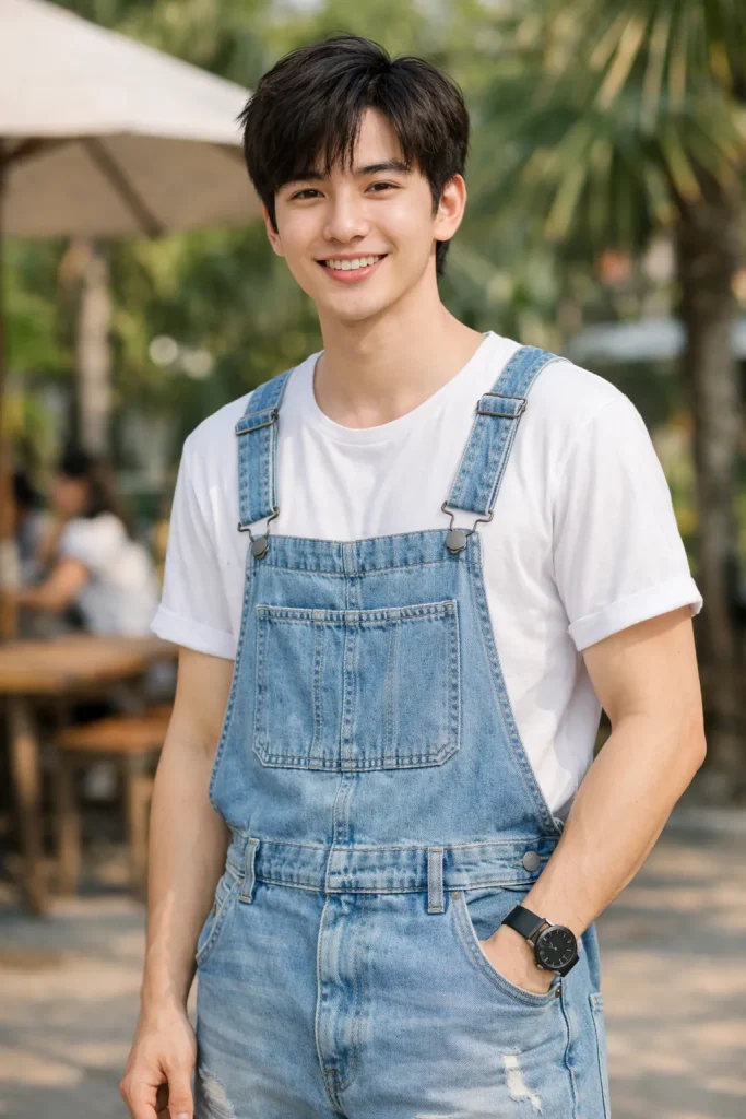 ชุดเอี๊ยมก็เป็นอีกไอเท็มที่หนุ่มเริ่มใส่กัน แต่ถ้าจะใส่ในสภาพอากาศร้อน ๆ แบบเมืองไทยยังงี้ ก็ตัดผ้าพันคอออก ก็ได้ลุคที่ดูหล่อ แบบน่ารัก ๆ แล้ว
