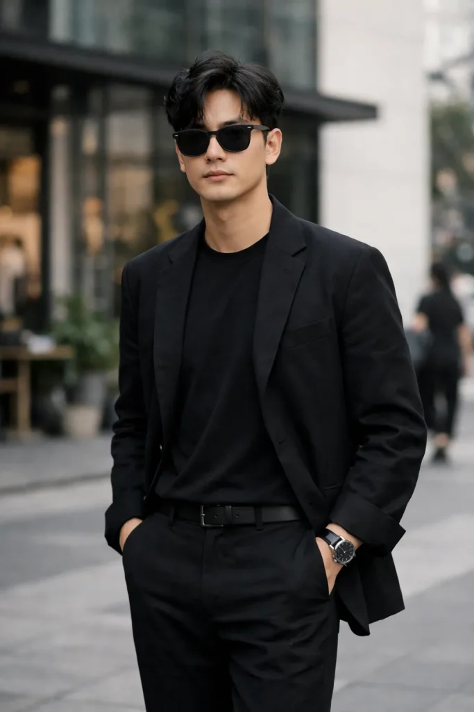สไตล์มินิมอลแบบคุมโทนสีดำทั้งตัว ก็ช่วยให้หนุ่ม ๆ ดูเท่ แบบลุคนิ่ง ๆ