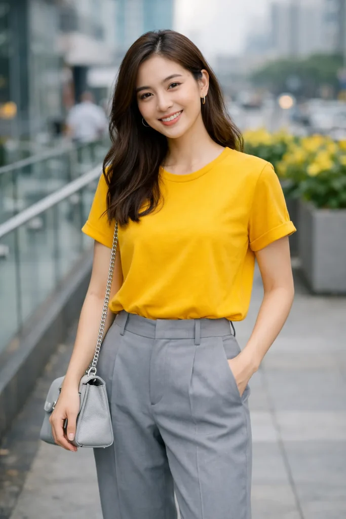 สาวคนไหนที่อยากแต่งตัวในโทนสีนี้ดู คุณอาจจะเริ่มจากการใส่เสื้อสีเหลืองมัสตาร์ดคู่กับกางเกงทรงสวยสีเทาดู หรืออาจจะใส่เป็นเสื้อยืดสีเหลือกับเอี้ยมกระโปรงสีเทา ได้ฟีลสาวเกาหลีสุดชิคก็ได้ค่ะ แมทช์ง่าย ๆ เพียงเท่านี้คุณก็จะได้ลุคที่ดูสดใส ไม่จำเจ ว่าแล้วใครที่ยังไม่เคยลองแต่งตัวด้วยสีเหลืองกับสีเทาล่ะก็ ห้ามพลาดนะคะ