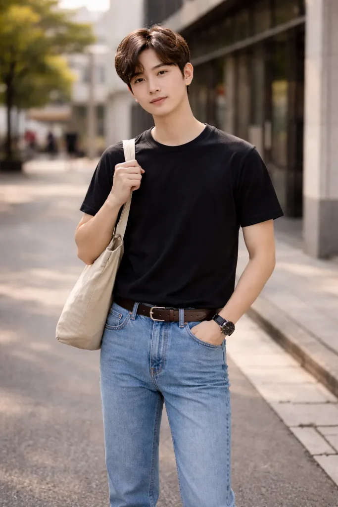 เป็นการแต่งตัวที่เบสิคสุด ๆ แค่คุณมีกางเกงยีนส์ดีไซน์ดี ๆ เนื้อผ้าดี ๆ สักตัว จะใส่ไปไหนก็หล่อ สีฟอกซีดแบบนี้ก็เท่แบบเซอร์ ๆ ได้ ส่วนเสื้อถ้าจะให้ดีก็ควรเป็นสีขาว สีเทา Top dye หรือสีดำไปเลย ใส่ง่ายได้ตลอด แถมเข้ากับกางเกงยีนส์ทุกสีเฉดอีกต่างหาก