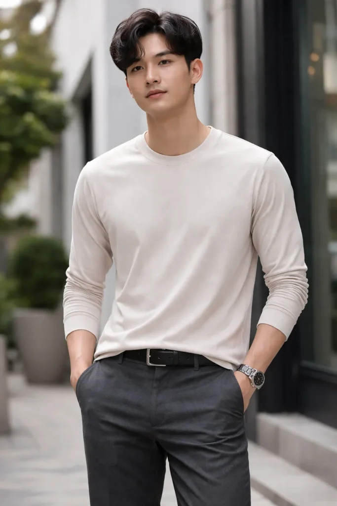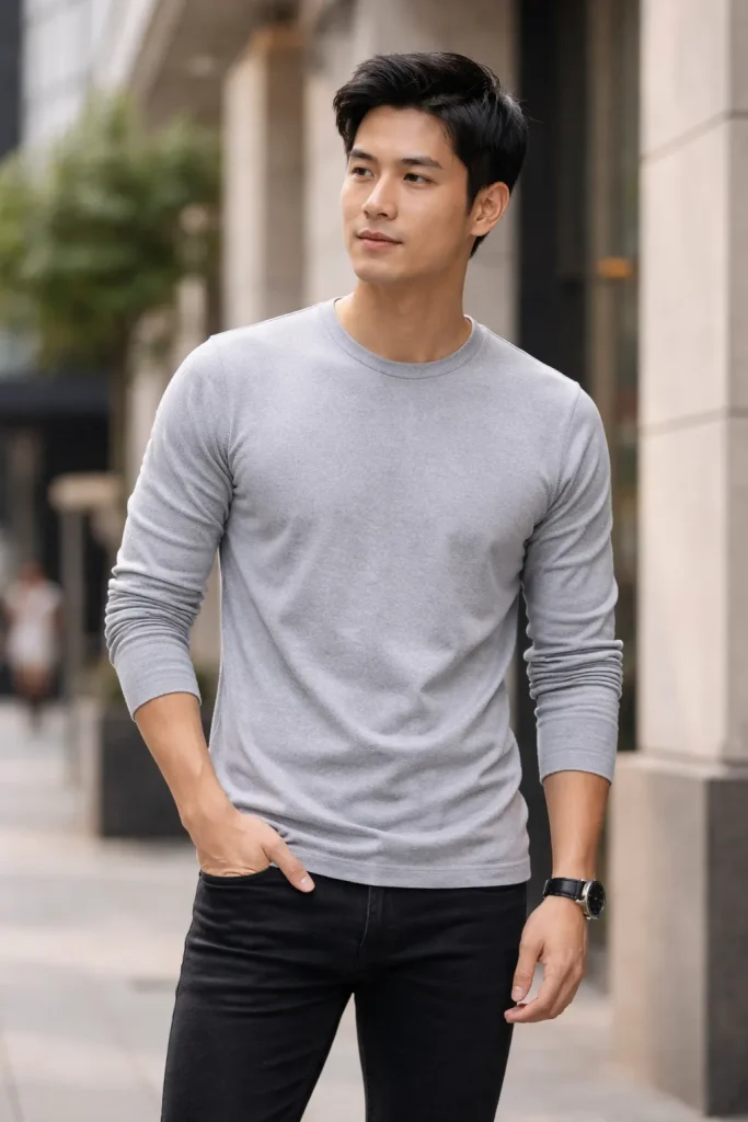 เสื้อยืดแขนยาวเป็นอีกไอเท็มที่ใส่แล้วดูดีแน่นอน ควรเลือกเสื้อที่มีไซส์พอดีตัวไม่ฟิต ไม่หลวมมากเกินไป