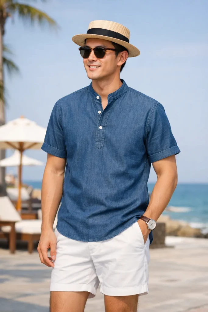 สวมเสื้อเชิ้ตคอจีนกับกางเกงขาสั้น แมทช์เข้ากันได้ดีกับหมวกทรง Boater ได้ลุคซัเมอร์เบาๆ