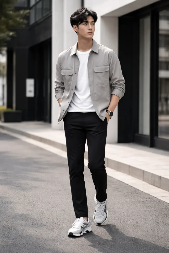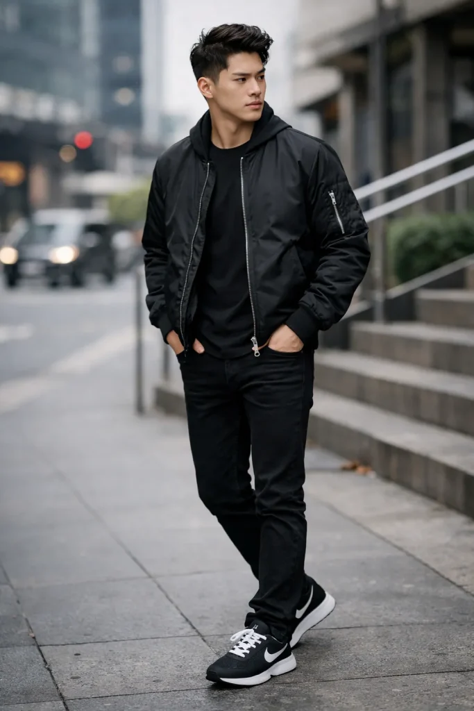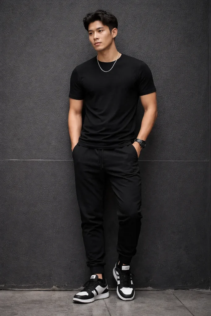 เพียงเสื้อดำ 1 ตัว กางเกงสีดำ 1 ตัว รองเท้าผ้าใบ 1 คู่ ก็จะทำให้คุณดูเป็นหนุ่มมีสไตล์
