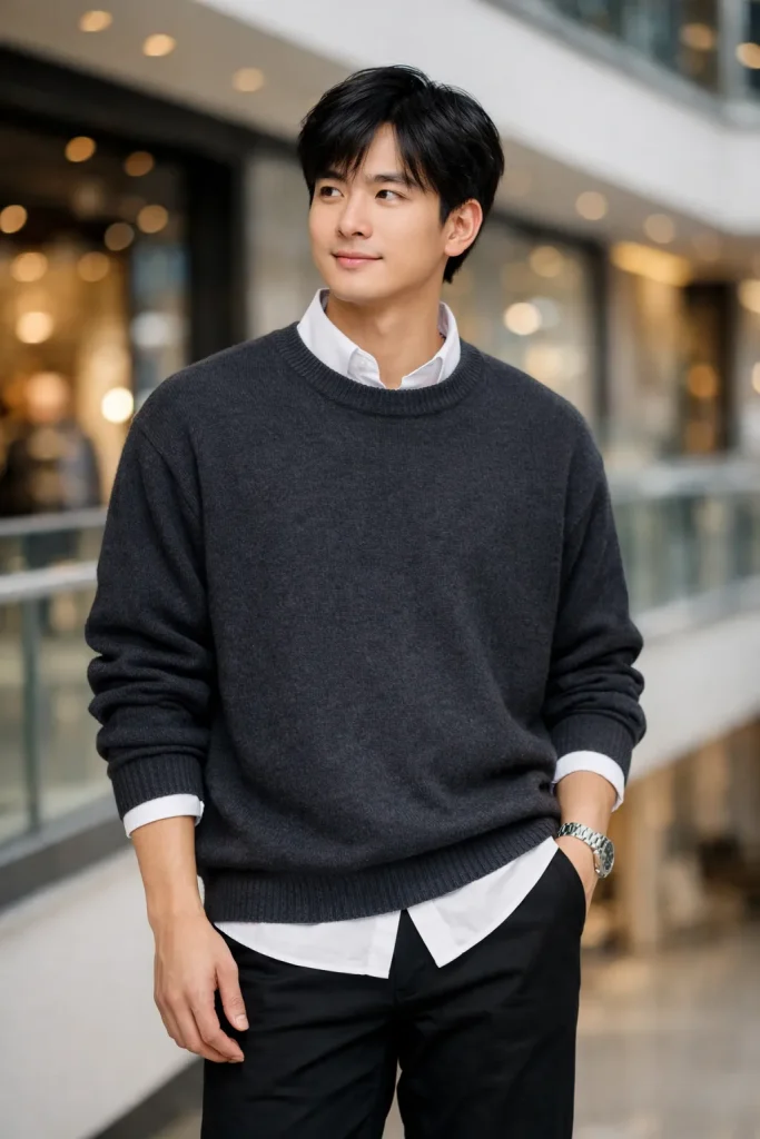 หากวันไหนคุณมีนัดที่ห้างสรรพสินค้า หรือ มั่นใจว่าวันนี้จะได้เจอกับแอร์เย็น ๆ ทั้งวัน ลองดู Look ง่าย ๆ อย่างตัวอย่างนี้หาเสื้อเชิ๊ตสีขาวที่หนุ่ม ๆ ต้องมีติดบ้านไว้ซักตัว ใส่ทับด้วย Sweater สีเทาเข้ม ๆ หรือดำไปเลยแต่ข้อควรระวังคือ Sweaterควรจะไซส์ใหญ่กว่าตัวเล็กน้อย เวลาใส่ทับเสื้อเชิ้ตด้านในแล้วจะได้ไม่รัดติ้วจนน่าเกลียด