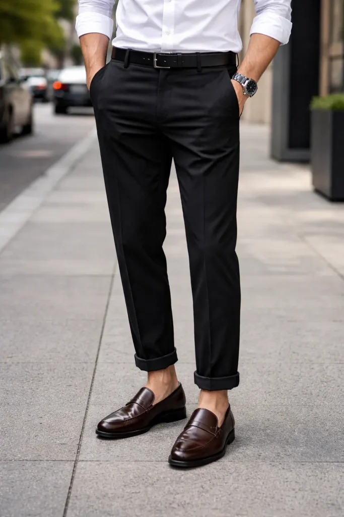 แล้วไล่ระดับความเข้มขึ้่นด้วยกางกางแสลคสีดำหากจะเพิ่มลายละเอียดเล็ก ๆ พับขากางเกงขึ้นเล็กน้อยซัก 3 นิ้ว แล้วใส่รองเท้าหนังสีเข้ม ๆ ก็ได้ไม่ว่ากัน แต่อย่าลืมนะถ้าหากคุณจะพับขาล่ะก็ต้องมั่นใจว่าวันนั้นถุงเท้า ของไม่ใช่ถุงเท้านักเรียนเหลือใช้หรือถุงเท้ากีฬาที่ยังไม่ได้ซัก ลองเปลี่ยนเป็นถุงเท้าที่หุ้มแค่ส้นเท้าก็พอ ถ้าไม่มีก็พับถุงเท้าให้เกินเข้าไปจนถึงส้นเท้าดูแต่จะง่ายกว่ามากถ้าคุณไม่ใส่มันเลย