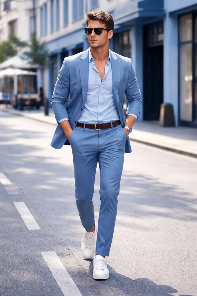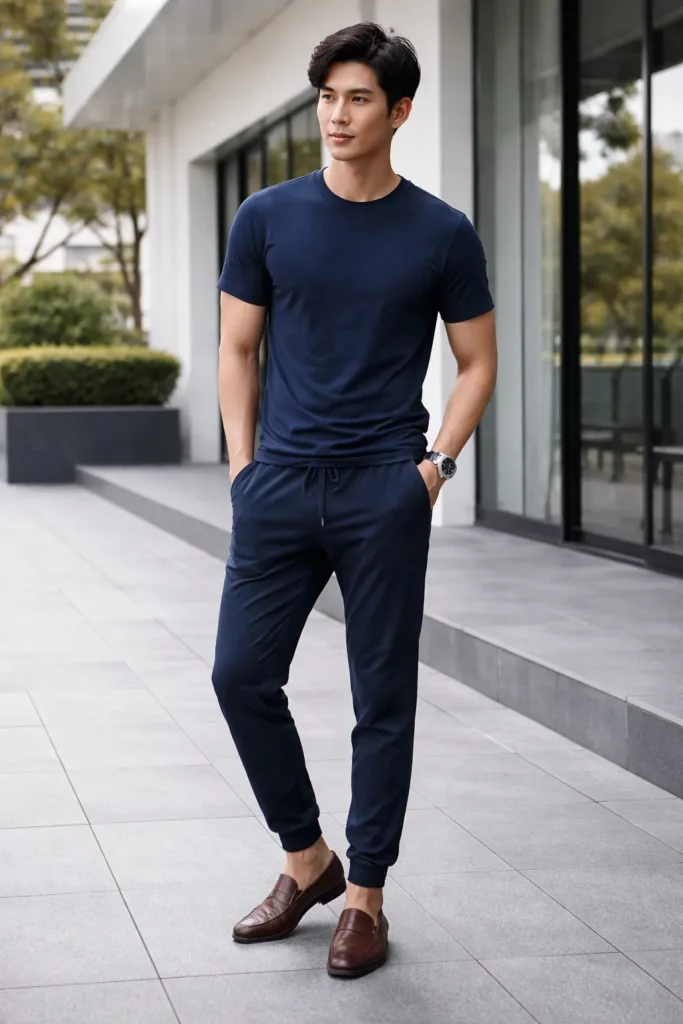 ถ้าสีอ่อนจะทำให้คุณดูขิขุไปล่ะก็ ลองมาที่สีน้ำเงินกันดีกว่า เสื้อยืดง่าย ๆ กับกางเกง Jogger หรือ ถ้ากลัวจะดูเหมือนไปวิ่งลองเซทผม แล้วใส่รองเท้าหนังแบบ Loafers แทนที่จะใส่ผ้าใบเพิ่มนาฬิกาเรียบหรูซักเรือน ก็ทำให้คุณหนุ่ม ๆ มีสไตล์ทั้งเท่ เนียบและดู Sport ไปในตัว