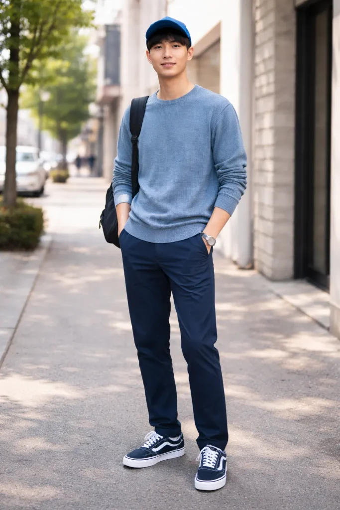 ลองเริ่มด้วย Sweater สีฟ้าอมเทาไอเท็มง่าย ๆ ที่หนุ่ม ๆ ทุกคนควรมีเป็นหลัก มาประกบกับกางเกงสีน้ำเงิน ยิ่งเพิ่มความวัยรุ่นด้วย หมวกสีน้ำเงินหรือฟ้า รองเท้าผ้าใบง่าย ๆ แบบ Vans หรือ Converse คู่สีเดียวกันก็พร้อมจะออกจากบ้านแล้ว