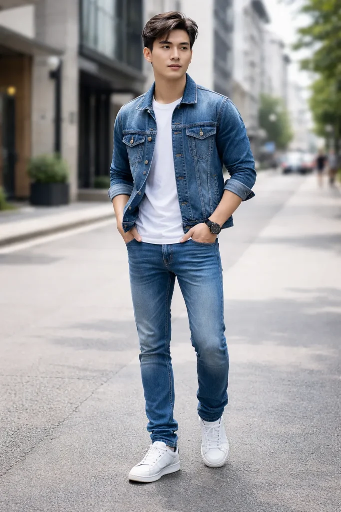 เสื้อผ้าสีน้ำเงิน ฟ้า ที่มีกันอยู่ แน่นอนว่าเราก็ต้องยีนส์อยู่ในเหล่าสีนั้นอยู่แล้ว ลองสะบัดกางเกงยีนส์ของคุณและลงทุนซื้อแจ๊กเก็ตยีนส์ไซส์พอดี ๆ จับบวกกับเสื้อยืดธรรมดาสีเข้ากัน รองเท้า Sneaker หรือผ้าใบ ซักคู่วันนี้คุณก็จะดูเท่ มีสไตล์ แบบแมน ๆ