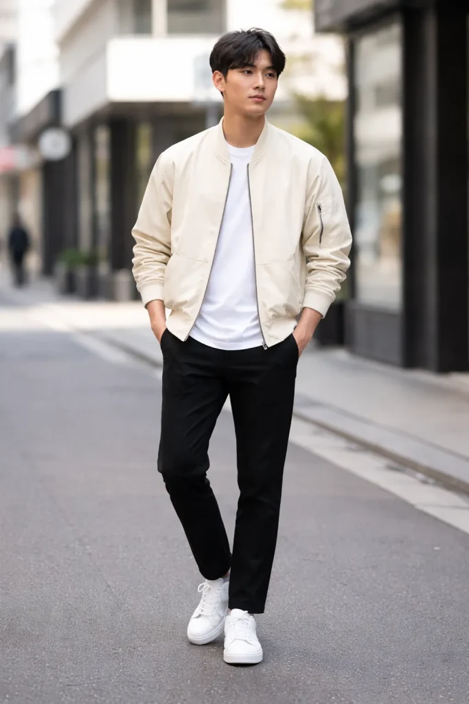 ถ้าคุณมี Bomber jacket สีครีมอยู่ล่ะก็ลอง กับเสื้อผ้าสีขาวหรือดำ จับคู่กับรองเท้าผ้าใบสีขาวดูก็จะได้ Look สตรีท ๆ ที่ดูสบายตา
