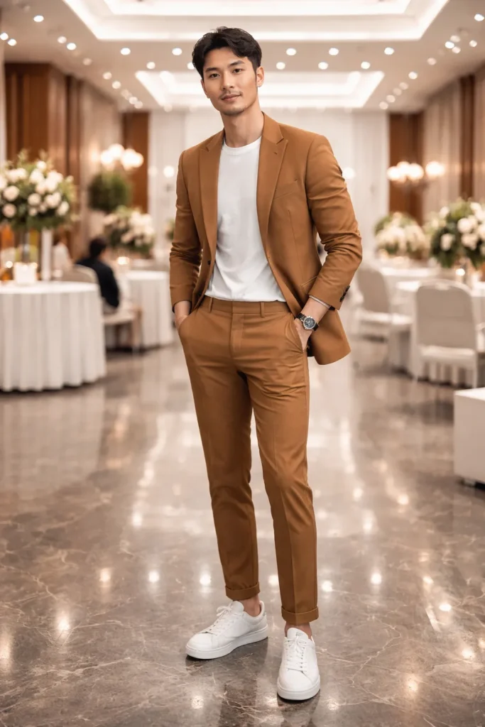 ถ้าต้องการออกงานแต่เบื่อสูทสีน้ำเงินที่ดูจำเจกับคนอื่น ๆ ในงาน หรือ อยากจะเลี่ยงสีดำในงานมงคล ก็ลองเป็นสูทสีน้ำตาล Caramel ก็ได้ เพิ่มความสบาย ๆ ด้วยเสื้อยืดสีขาวแทนเสื้อเชิ๊ต กางเกงชิโน่ รองเท้าผ้าใบแทนที่จะเป็นรองเท้าหนัง ก็ทำให้คุณผู้ชายทั้งหลายสามารถออกงานทางการได้อย่างโดดเด่น คงไว้ทั้งความเป็นทางการ และความเป็นวัยรุ่น