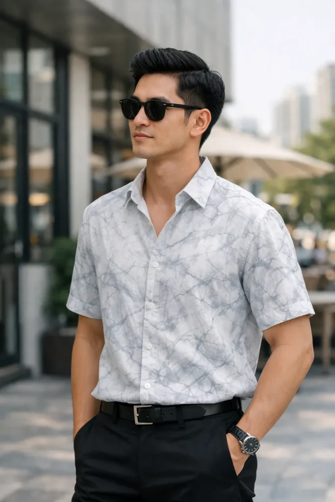 ส่วนในวันที่เราอยากเพิ่มลูกเล่น การเพิ่มสีสันให้กับลุคคลีน ๆ ด้วยเสื้อเชิ้ตที่มีลวดลายเข้ามา ก็เป็นอีกหนึ่งทางเลือกที่จะทำให้การแต่งตัวของหนุ่ม ๆ ดูสนุกขึ้นได้ การเลือกลายก็ควรเลือกที่ลายไม่ต้องชัดเจนมาก เช่น Grid หรือ Marble ลวดลายบาง ๆ ที่เสริมลูกเล่นให้กับลุคของเราให้ไม่เรียบง่ายจนเกินไป