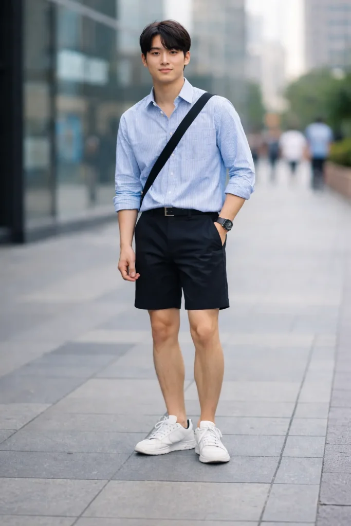 ถึงแม้ว่าเสื้อเชิ้ตจะเป็นไอเท็มที่ดูเหมือนเป็นทางการ แต่เราก็สามารถปรับเปลี่ยนให้ลุคดูสบาย ๆ ขึ้นได้ด้วยการจับคู่กับกางเกงขาสั้น เป็นลุคที่บาลานซ์ระหว่างความเป็นทางการกับความชิลล์ได้เป็นอย่างดี แถมลุคนี้ยังเป็นลุคที่หนุ่ม ๆ เกาหลีเขากำลังนิยมกันด้วยนะจ๊ะ จะใส่กับรองเท้าผ้าใบให้ดูเท่ ๆ หรือใส่กับ Sander ให้กลายเป็นแฟชั่นนิสต้าหนุ่มก็ดูเท่ไม่เบา
